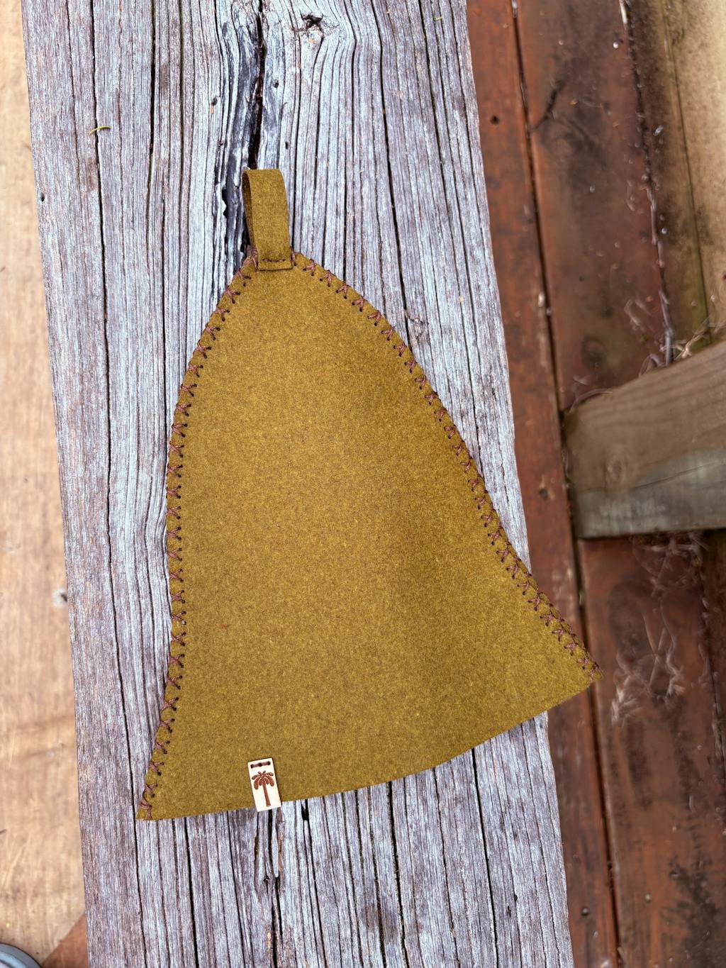 This traditional sauna hat (sauna cap) is handcrafted from 100% New Zealand wool in a solid green design, made to protect your head from extreme heat and help keep your body temperature balanced during sauna sessions.